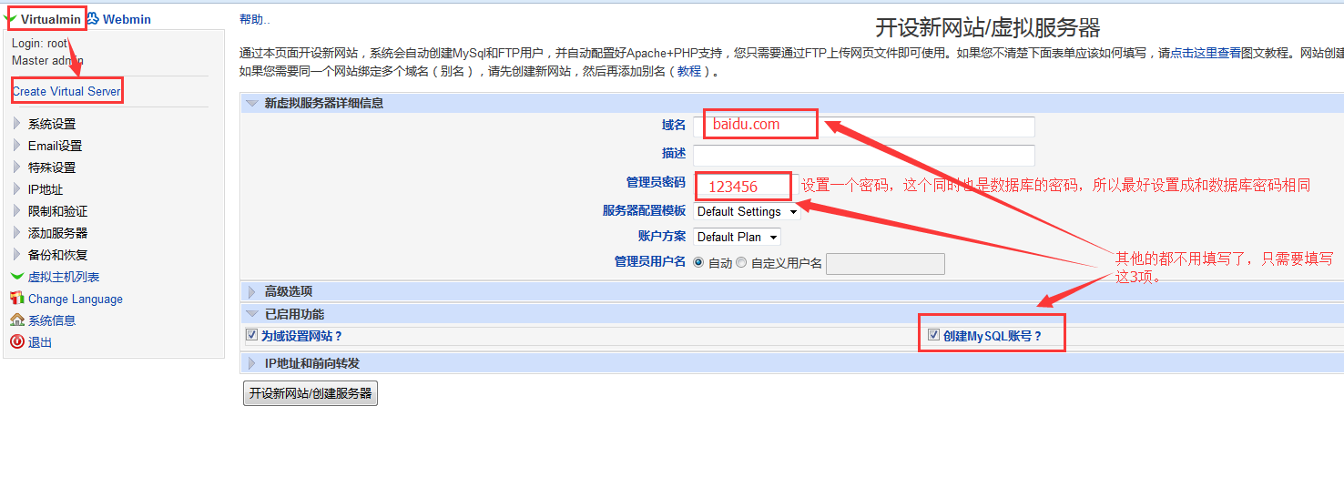 登陸webmin,根據(jù)提示填寫相關(guān)選項(xiàng),開始創(chuàng)建網(wǎng)站