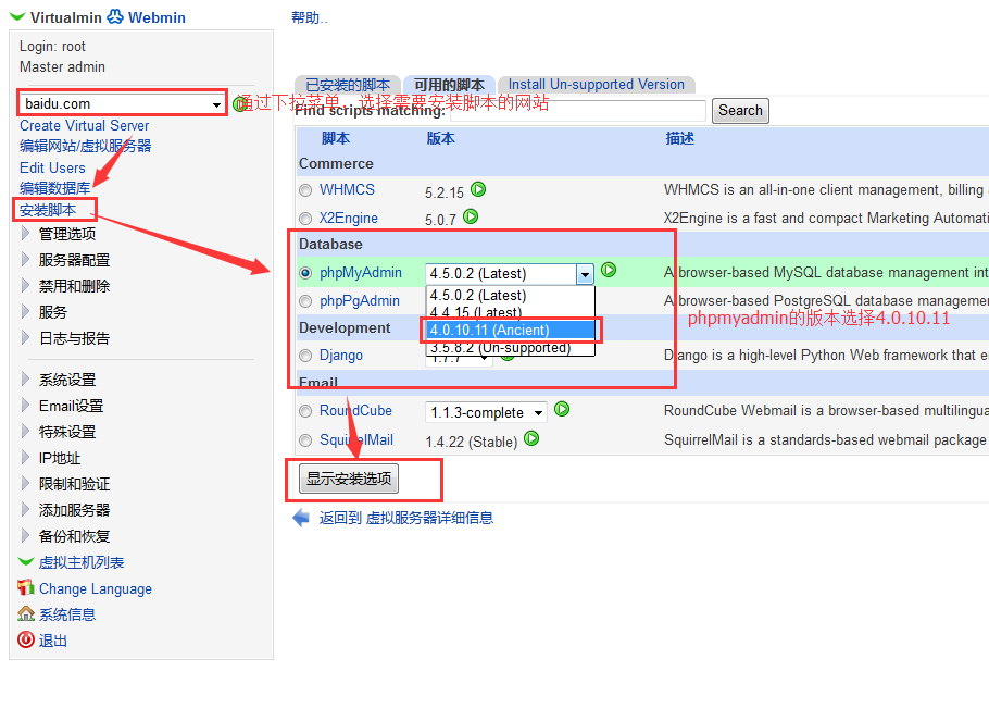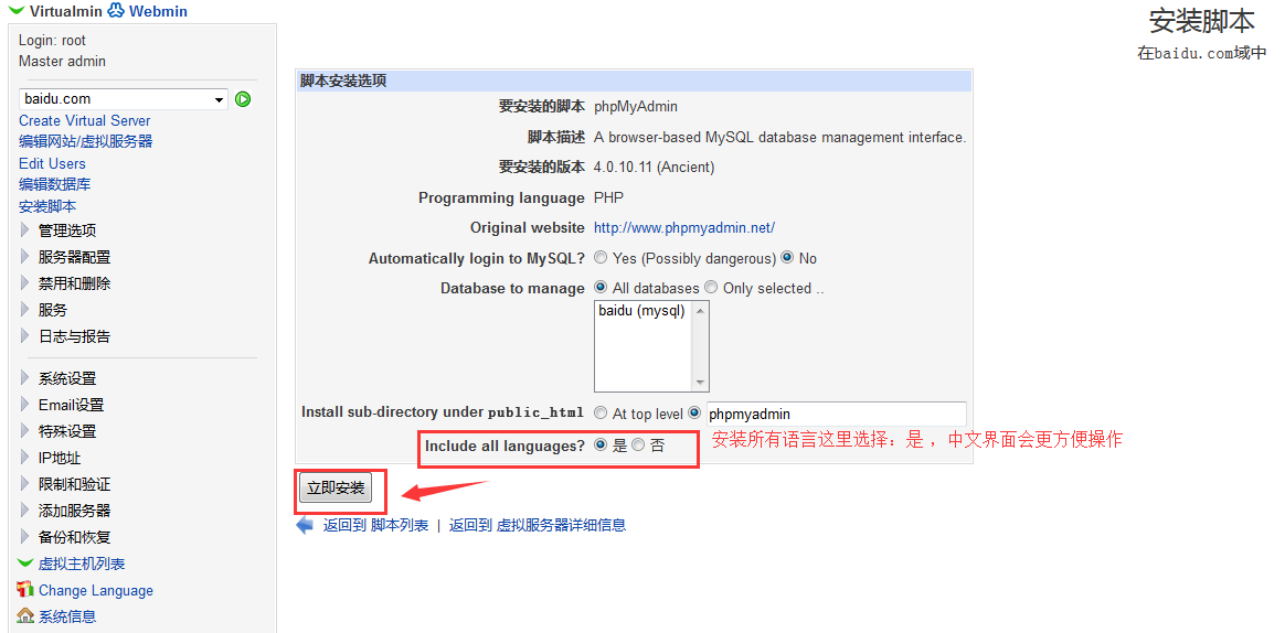 接下來等待腳本安裝完成后,你就可以通過:域名/phpmyadmin例如:baidu.com/phpmyadmin
