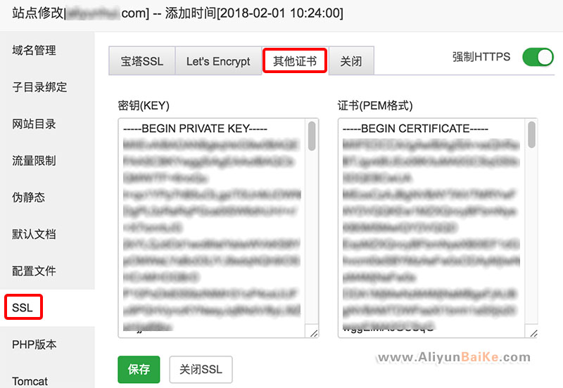 寶塔BT面板后臺自帶SSL證書安裝方式,但是安裝過程中一直顯示“域名解析錯誤,或解析未生效”,發(fā)現(xiàn)很多朋友也遇到這種情況,所以阿里云百科網(wǎng)選擇了另一種解決方法,去申請其他證書,然后將密鑰(KEY)和證書(PEM格式)粘貼到寶塔BT面板后臺。