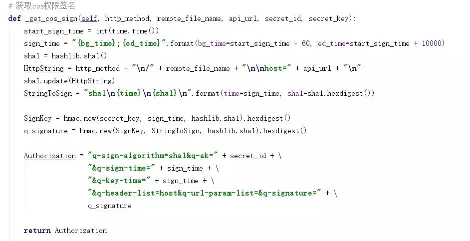 函數(shù)中,sign_time為簽名的有效時間,http_method為操作方式(上傳文件時用PUT,獲取文件時用GET),remote_file_name為上傳到cos的文件名,api_url為bucket的訪問地址,secret_id和secret_key都是騰訊云API密鑰。