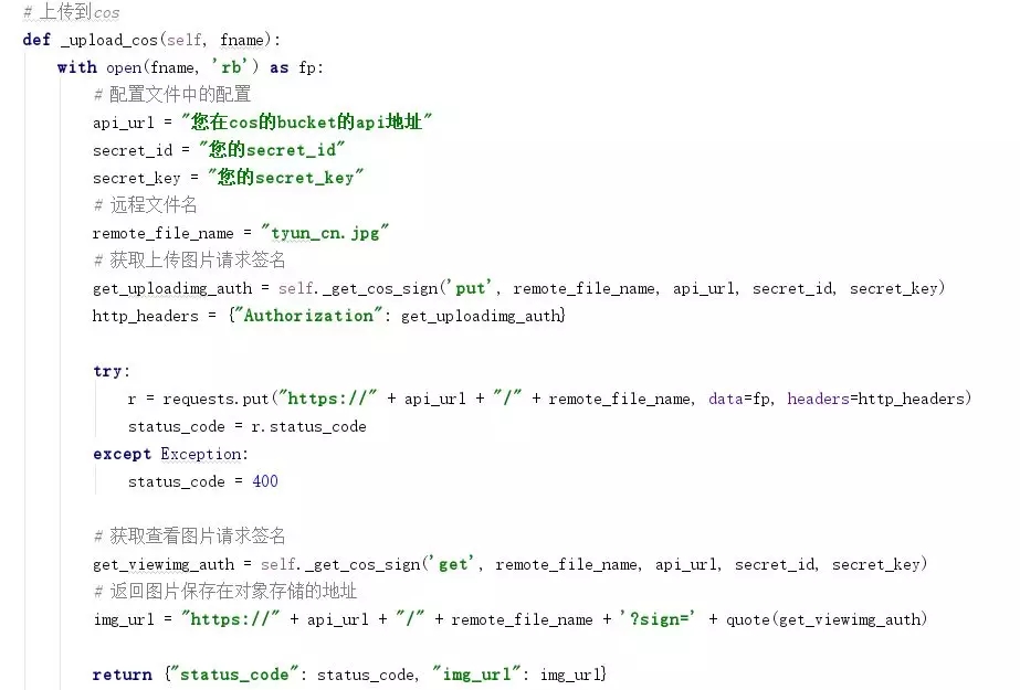 上圖,就是把圖片從服務(wù)器上傳到cos的大致實現(xiàn),其中fname是圖片在服務(wù)器上的地址,_get_cos_sign()函數(shù)就是前面生成請求簽名的函數(shù)。