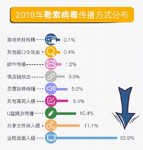 根據(jù)報告, 2018 年勒索病毒家族流行度排行,GandCrab、Globelmposter、Crysis這三大勒索病毒家族的受害者最多,合共占比80.2%。“十大流行”勒索病毒家族中,九個勒索病毒家族涉及企業(yè)攻擊,企業(yè)是本年度勒索病毒最為熱衷的攻擊對象。勒索病毒感染最嚴(yán)重的地區(qū)為廣東,占比高達(dá)18.5%;其次江蘇占比8.1%;浙江排名第三,占比7.2%