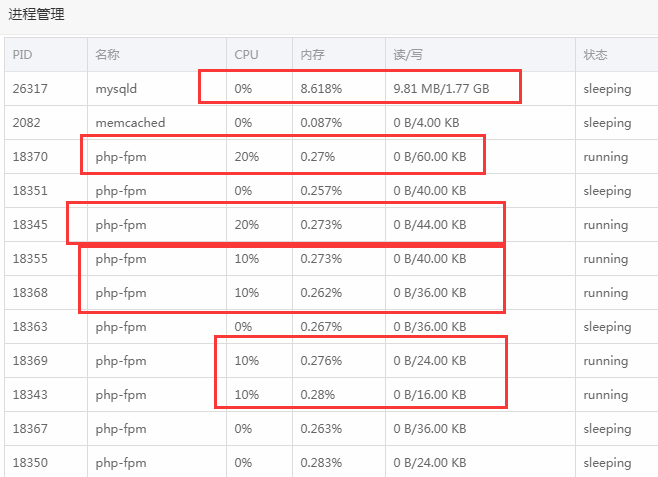 看到這種情況,小編首先推薦用戶參看《Linux寶塔面板CPU占滿100%,負載100%網站緩慢解決方法》一文嘗試解決。但是用戶還是無法解決。最后小編只能親自上手,登錄面板后發(fā)現(xiàn),該用戶出現(xiàn)的這個CPU占面100%的情況并非是由于SQL數(shù)據庫負載引起,而是由于php-fpm進程過多導致,如下圖所示: