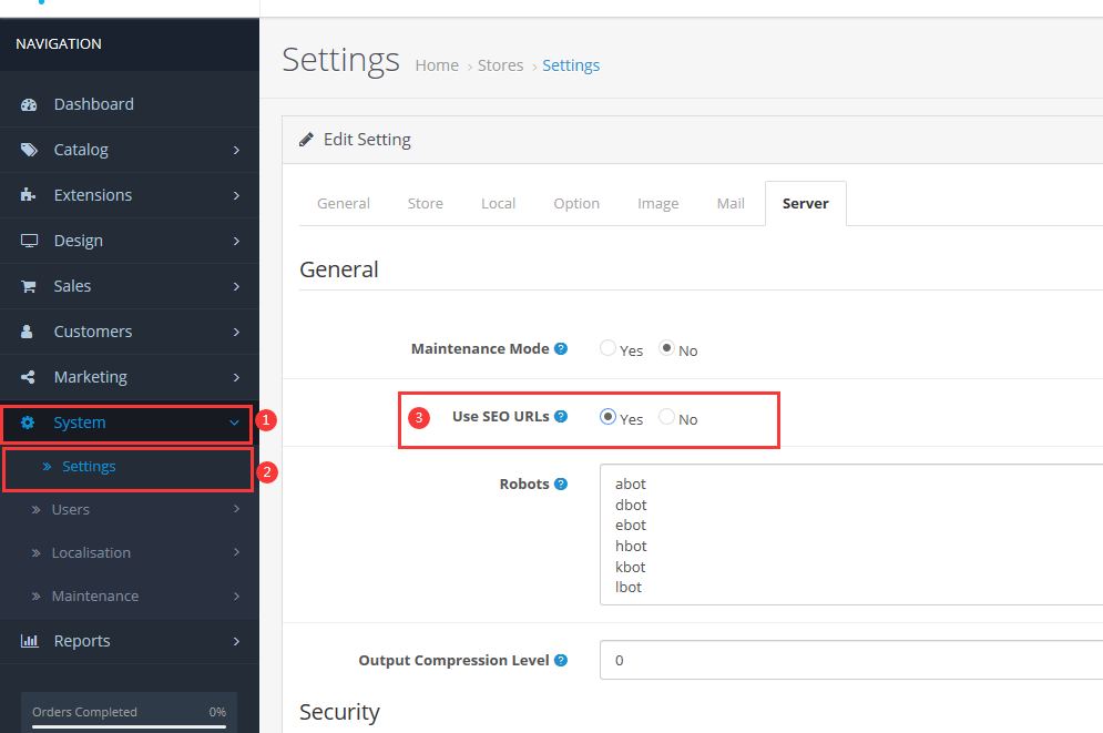 system(系統(tǒng)設(shè)置) -> settings(店鋪設(shè)置) -> 店鋪設(shè)置的 server 這一欄 ,use SEO URLs 選擇Yes 開(kāi)啟