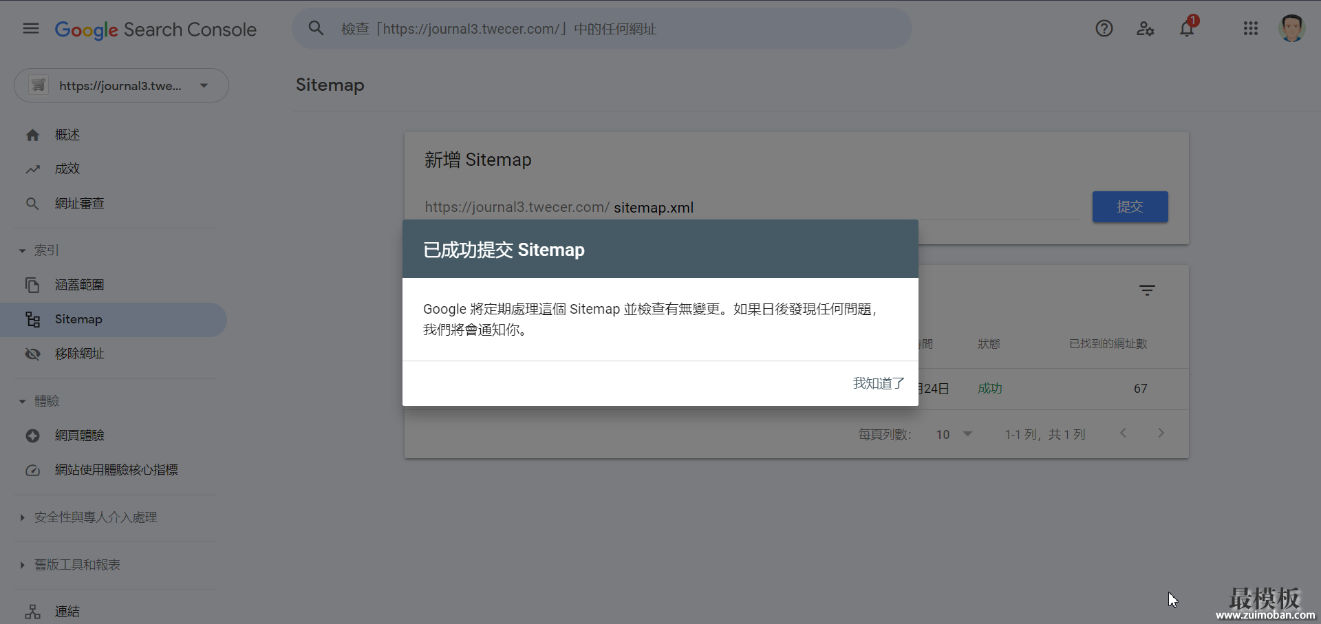 提交之后Google Search Console 就會(huì)立即讀取Sitemap 內(nèi)容及解析,如果沒有意外情形,就會(huì)順利完成,并顯示已找到的網(wǎng)址數(shù),不過涵蓋范圍、成效等單元,都必須等一天之后才會(huì)有資料。