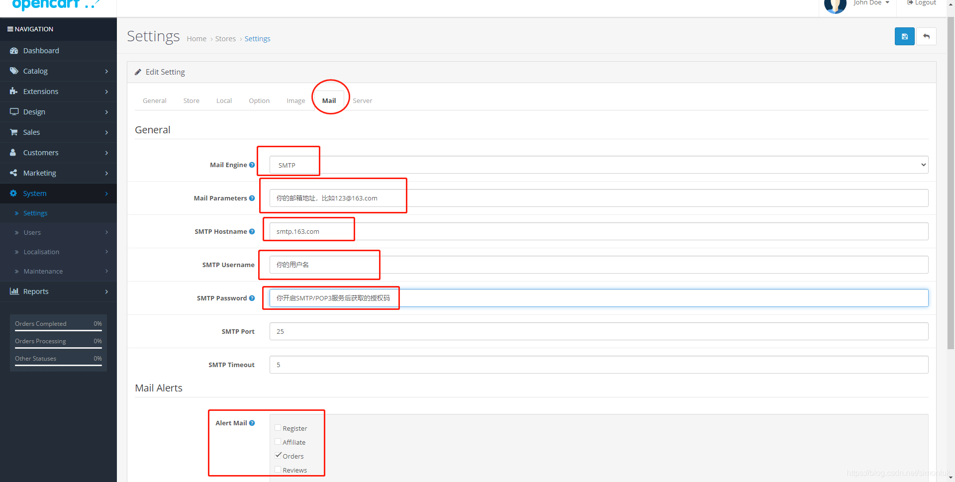 上圖我畫(huà)圈的需要配置,Mail Engine一般選SMTP,因?yàn)檫@個(gè)不需要服務(wù)器的依賴(lài),如果是選Mail,需要服務(wù)器安裝發(fā)送郵件的軟件,端口25一般不用動(dòng),如果需要ssl協(xié)議你要設(shè)置965端口,視具體情況而定設(shè)置好郵箱參數(shù)后,下方的Mail Alerts可以設(shè)置郵件提醒的類(lèi)型,第一個(gè)Register注冊(cè)時(shí)提醒,第二個(gè)Affiliate有會(huì)員加盟時(shí)提醒,