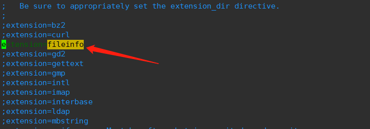 如果沒有找到如圖類似的代碼,可以自己手動在文件尾添加:extension=fileinfo.so,保存退出。