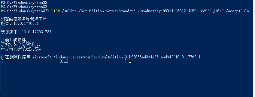 2。輸入 DISM /Online /Set-Edition:ServerStandard /ProductKey:N69G4-B89J2-4G8F4-WWYCC-J464C /AcceptEula