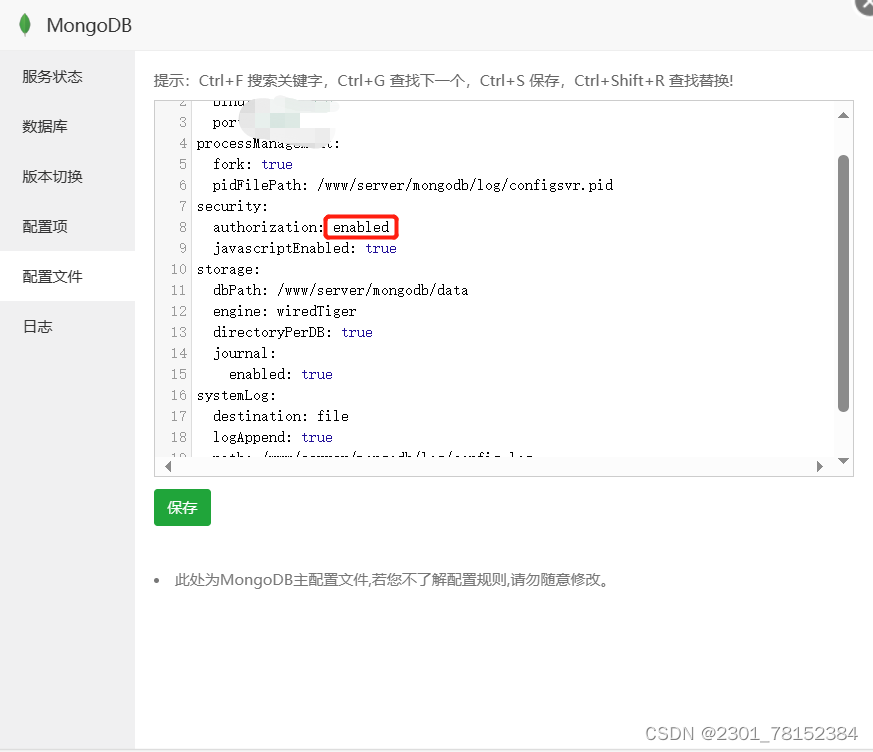 第一步:首先看mongodb的配置文件,如果authorization是enabled改成disabled,再卸載MongoDB刪除www/server/mongodb目錄中的文件,并重新安裝MongoDB。